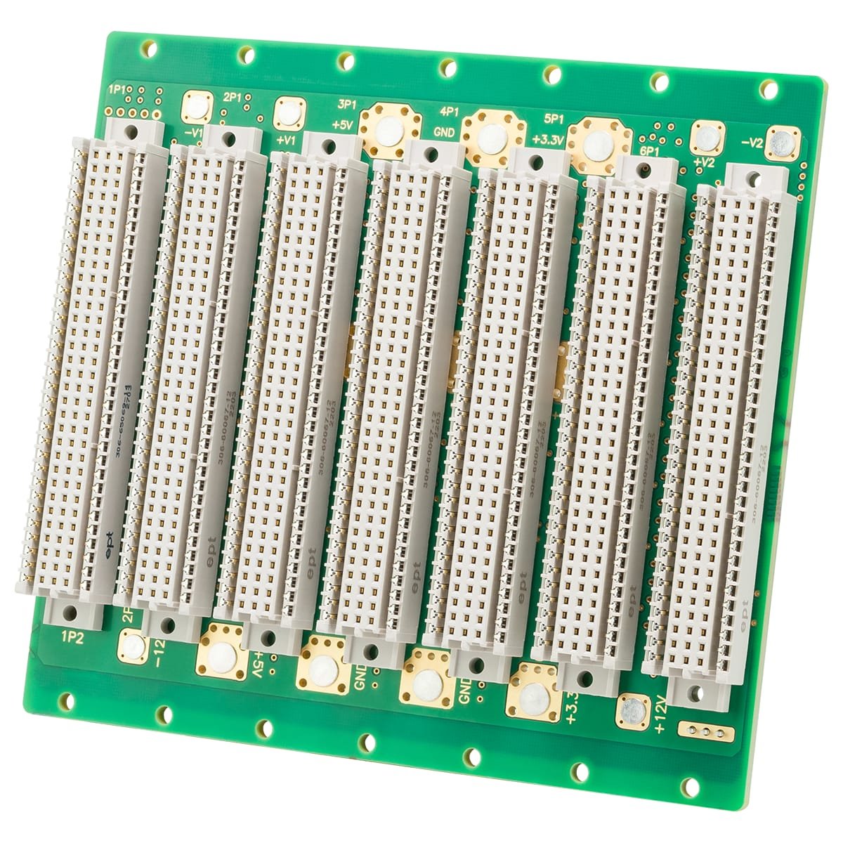 3 HE VME64x Backplane 7 Slots, VITA, passive interne Terminierung, Daisychain automatisch aktiviert, Stromzufuhr über M3/M4 Power-Bolzen, I/O-Pins 16 mm vergoldet, Zarge (1J1) optional Sperrklinke
