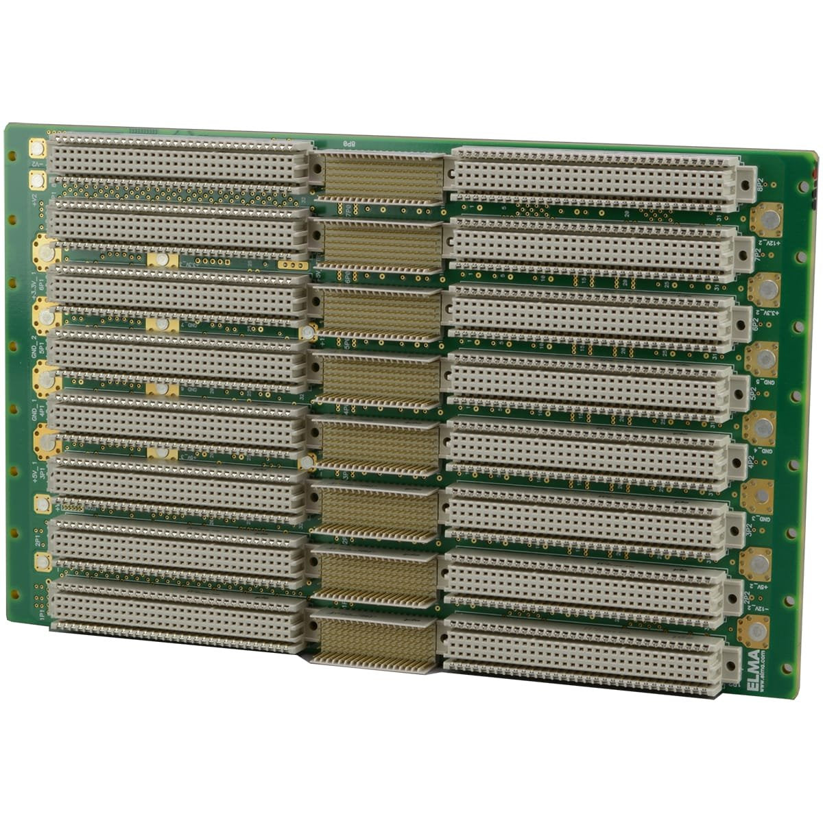 6 HE VME64x Backplane 8 Slots, VITA, passive interne Terminierung, Daisychain automatisch aktiviert, Stromzufuhr überM3/M4 Power-Bolzen, I/O-Pins 16 mm vergoldet, Übergaberahmen (1P1/nP2/nP0) mit optionaler Verriegelung