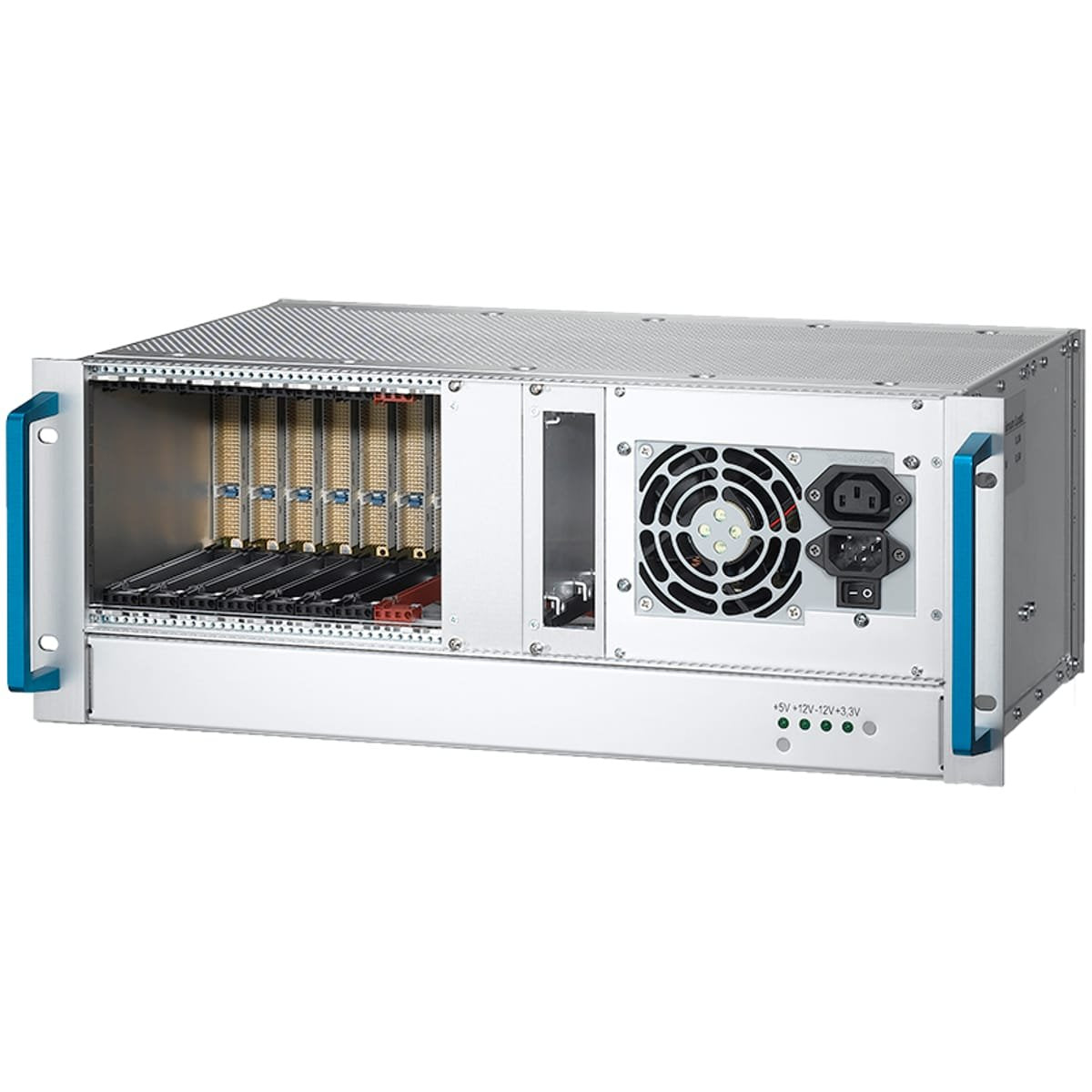 CompactPCI System Typ 12 mit 8 Slots, Systemslot auf der rechten Seite des Systems. 1x 350 W ATX, luftgekühlt mit fest eingebautem Lüfter und farblos chromatiert. Die Backplane ist vertikal eingebaut, hat vorne einen Kartenkorb mit 160 mm und 80 mm Rear IO.