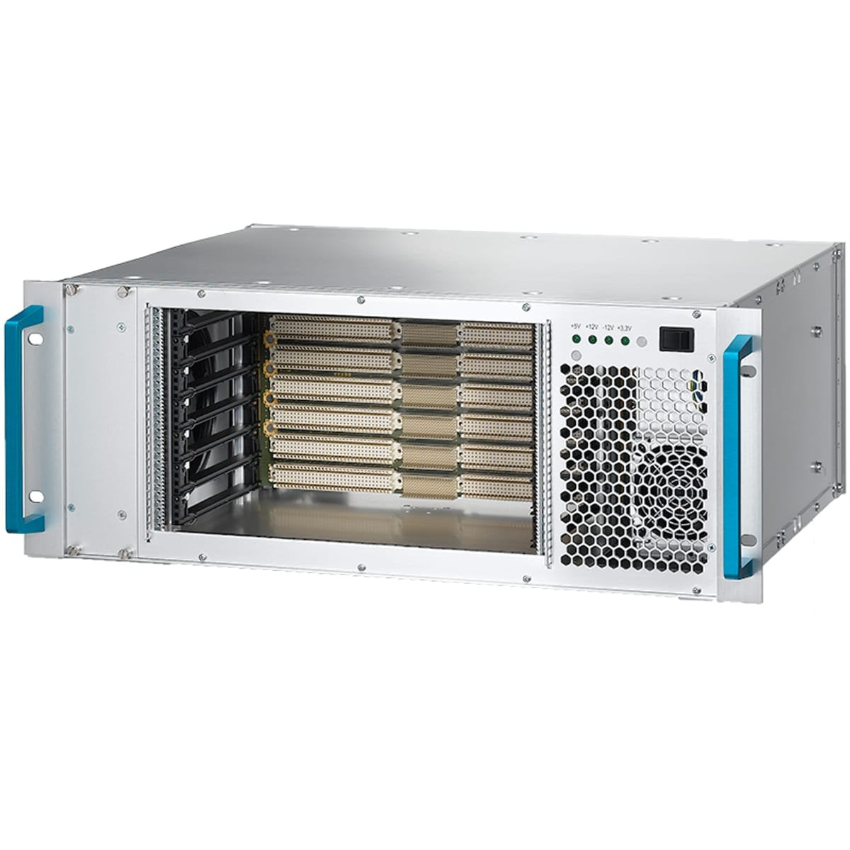 VME System Typ 12 mit 7 Slots, Arbiter in Slot 1 des Systems. 1x 700 W fest eingebaut, luftgekühlt mit Lüfterkassette und farblos chromatiert. Die Backplane ist horizontal eingebaut, hat vorne einen Kartenkorb mit 160 mm und 160 mm Rear IO.